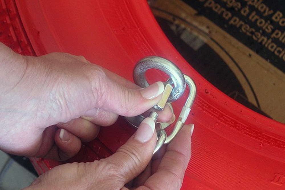 Боковина покрышки довольно широка и удобна и без дополнительных усовершенствований, а держаться можно за веревку подвеса. Поэтому для такой конструкции необходимо только подобрать хорошие крепления в виде болта с кольцом вместо шляпки (рым-болт), в который и нужно продеть подвес из цепи или шнура.