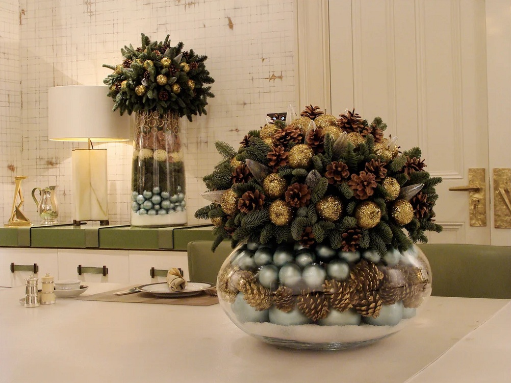 Небольшие горшочки можно оригинально украсить большими шишками. Большие прозрачные вазы, напоминающие аквариумы, также можно наполнить нарядными шишечками. Такой дизайнерский эксперимент всегда будет удачным.