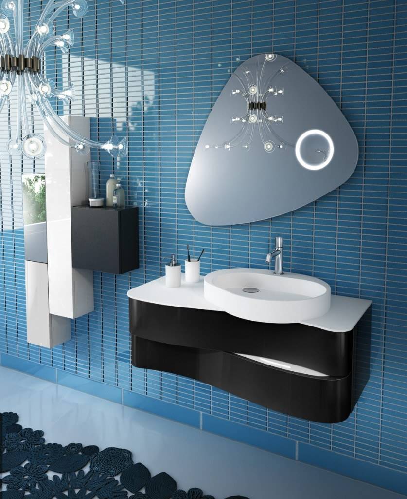 Голубой и синий цвет поможет реализовать морскую тематику. Если холодный синий цвет немного разбавить теплым оранжевым и добавить керамические белого цвета или из хромированного металла аксессуары, то ванное помещение станет комфортнее и уютнее.