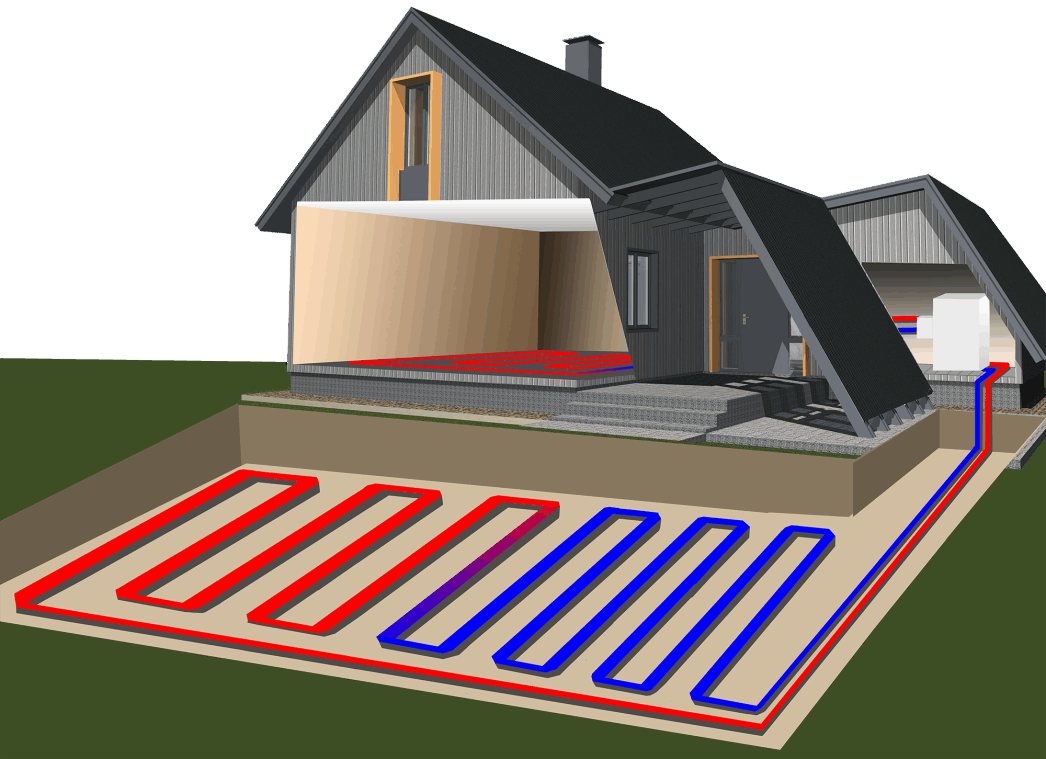 В данной схеме трубы погружаются в землю на глубину, где на протяжении всего года температура удерживается на уровне 7-10 градусов. Коллекторы могут располагаться вертикально и горизонтально. В 1-ом случае предстоит бурить несколько очень глубоких скважин, во втором – укладывать змеевик на определенной глубине.