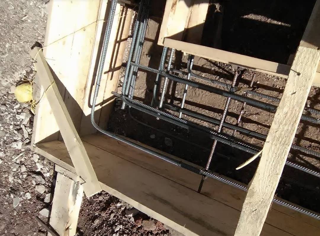 Технически это выглядит примерно так. На дно траншеи засыпают песок толщиной примерно 15 см, проливают его. Затем монтируют опалубку и заливают первый слой бетона примерно в 5 см. Чтобы выровнять основание. Потом монтируют опалубку.