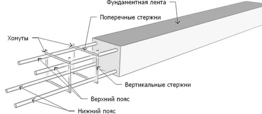 - Горизонтально лежащие «по ходу» фундамента прутья. Это рабочие прутки, именно на них будет ложиться основная нагрузка.