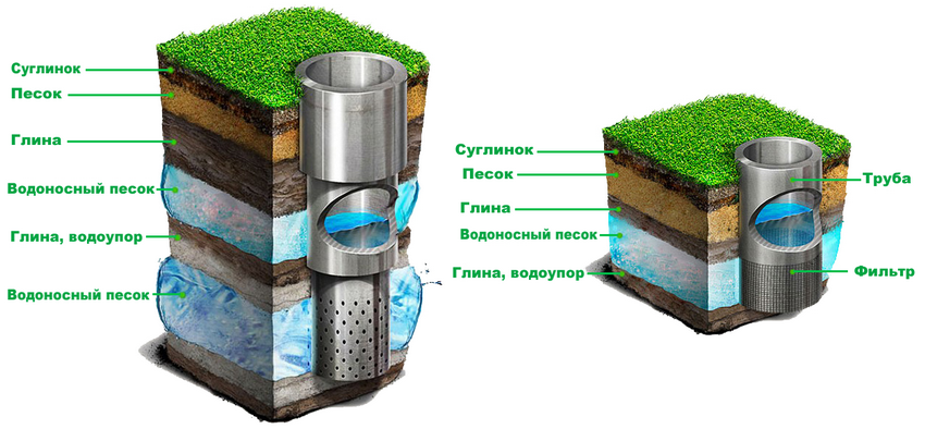 Расположение артезианской воды в пластах земли в сравнении с обычным колодцем