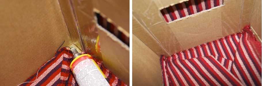 - Края трикотажной ткани подверните внутрь коробки и прочно зафиксируйте их.