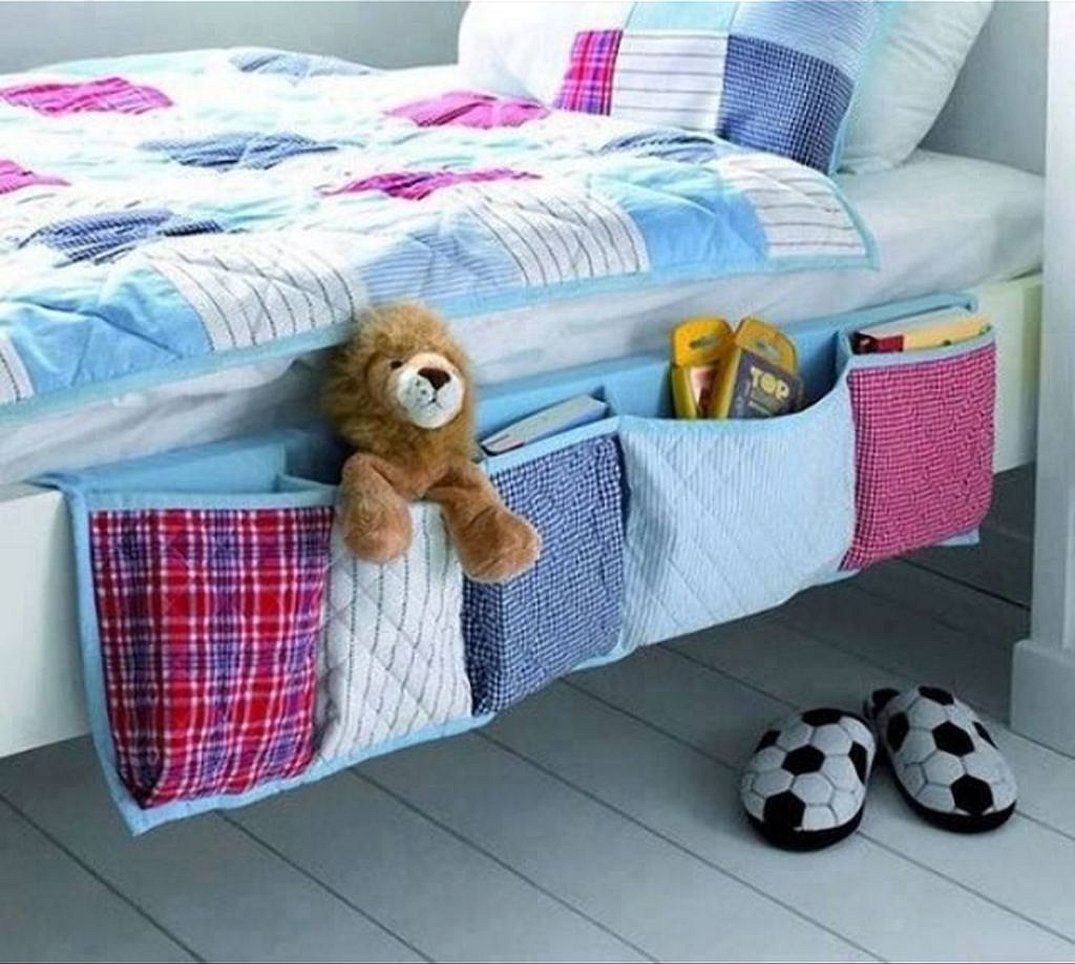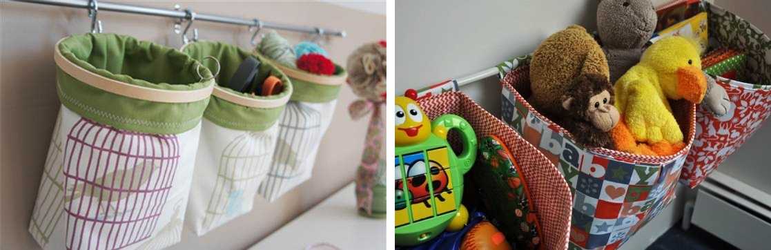 Можно сшить кармашки. Они продаются и готовыми в разделах аксессуаров. Выглядят они как кусок большой ткани, на котором сформированы удобные углубления. В них хорошо помещаются куклы, небольшие мягкие мишки и зайчики. Крепится кусок ткани обычно на боковой торец мебели. Ребёнок может в любой момент подойти, достать то, что ему нужно, а потом положить это на место.