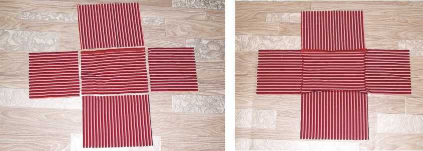 Если раскрой ведется в форме креста, то расход ткани получается больше, чем в случае, если заготовки выполняются отдельными деталями. Заготовки сшиваются так, чтобы получилось 2 мешочка