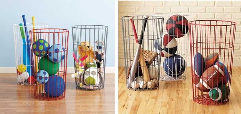 Но не все можно прикрепить на стены. Некоторые вещи требуют корзин или ящиков. Например, спортинентарь — все мячи, мячики и другие снаряды. Их удобно хранить в проволочных мусорных корзинах.