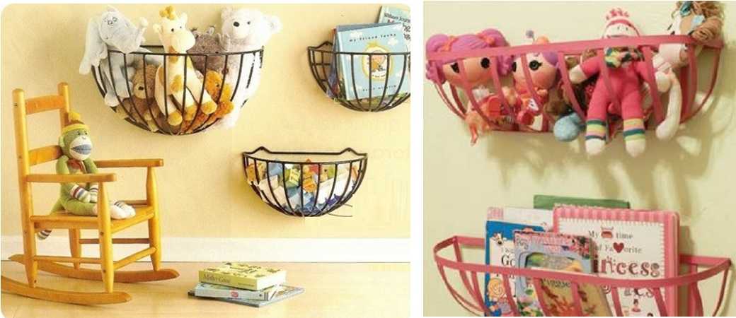 На стены можно повесить сетчатые кашпо из проволоки или пластика. В них тоже замечательно располагаются небольшие куклы-мишки-зайчики или машинки.