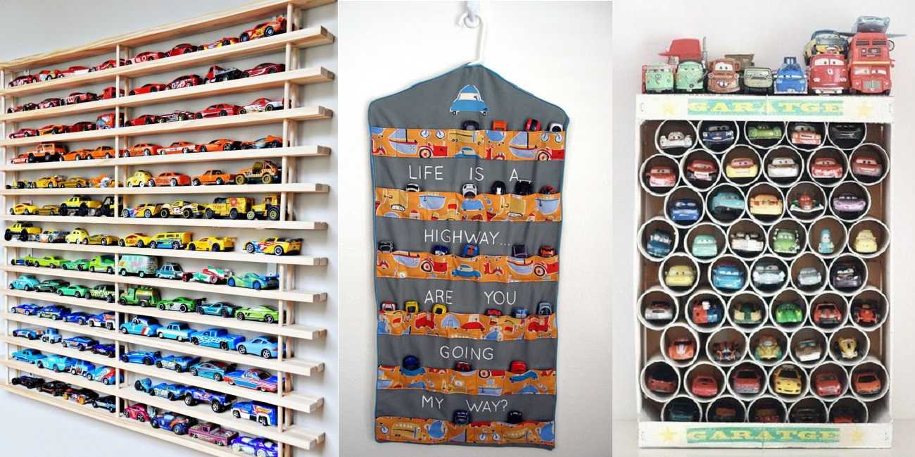 С мальчиками такой вариант не пройдет. У них обычно много машин и основная задача хранения игрушек мальчика — расставить машинки. Для этого можно сделать целый настенный гараж. Это длинные узкие полки, на которых и размещается весь автопарк. Еще варианты — прозрачные кармашки на ткани (продаются как системы хранения обуви) или полка, собранная из пластиковых труб.