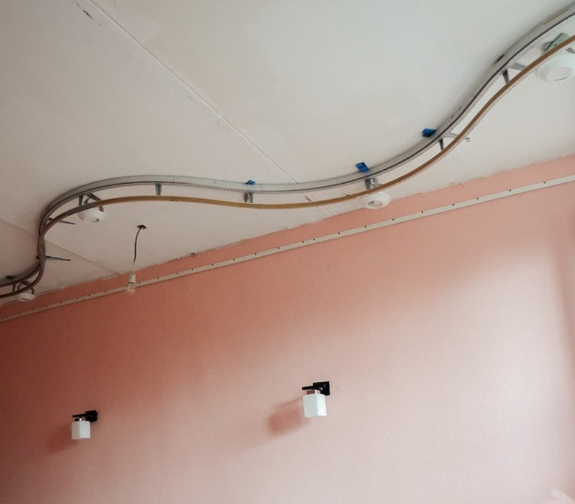 Без пластиковых профилей также не обойтись при создании радиусных (круглых, овальных, изогнутых) конструкций, особенно с гарпунными креплениями. Двухуровневый каркас также не выполнить без поливинилхлоридного багета.
