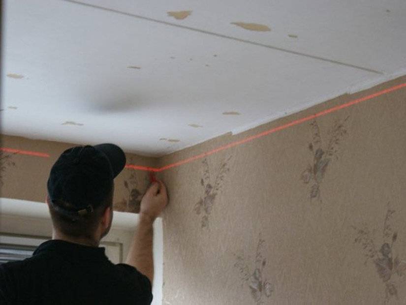 - Чтобы разметить линию, по которой будет равняться багет, нужно найти самое верхнее место по уровню и очертить линию по модели профиля, затем поставить метки по периметру помещения.