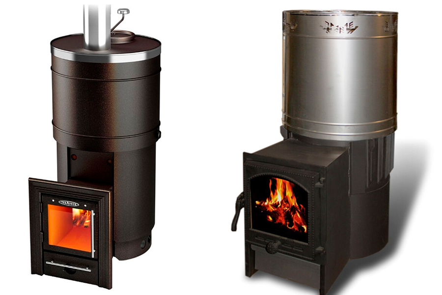 - Разнообразие конструкций изделий. По желанию можно установить над каменкой навесной бак в баню, расположить его возле топки или поместить на трубу дымохода.