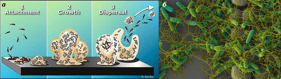 Рисунок 2. Биопленка. а — Формирование биопленки. б — Биопленка под электронным микроскопом.