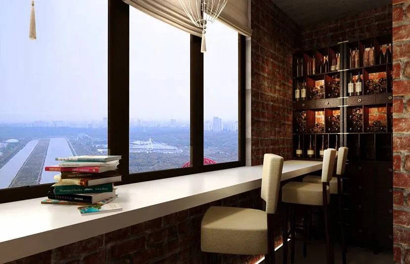 Но столика в привычном понимании этого слова может и не быть: его заменит барная стойка, начинающаяся сразу под окнами. Она может быть длиной в оконную зону, можно сделать ее и короче. К такой стойке приставьте 2 барных стула, и это уже будет сложившаяся композиция. Если столешницу сделать широкой, то за ней можно посидеть и с ноутбуком, а не только с кофе или коктейлем.