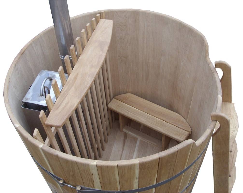 - Офуро. Одноместная мини-баня с подогревом из Японии. Полубочку размещают вертикально, в ней устанавливают сиденье и систему подогрева воды. Офуро часто размещается на открытом воздухе, в этом случае бочка закрывается сверху крышкой с вырезом для головы.