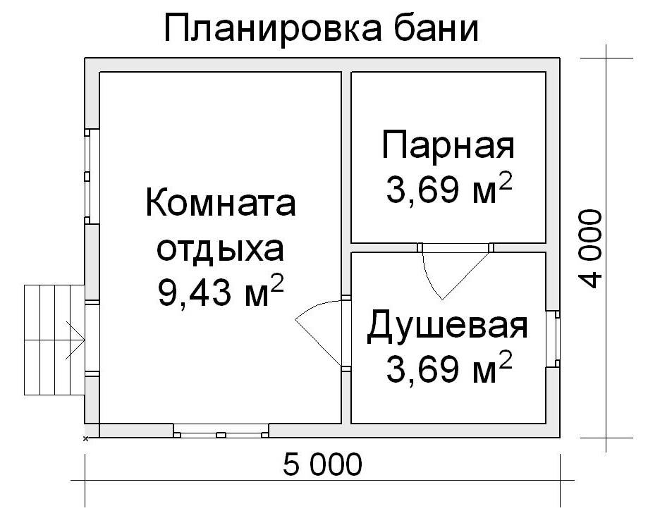 Душевая может предполагать кабину или ванну, а комната отдыха вмещать компактный диван, небольшую раздевалку, журнальный столик и т.д. Одновременно такая баня может вмещать до 5 человек. Если же париться будут один-двое, то помещения и того могут быть меньше.