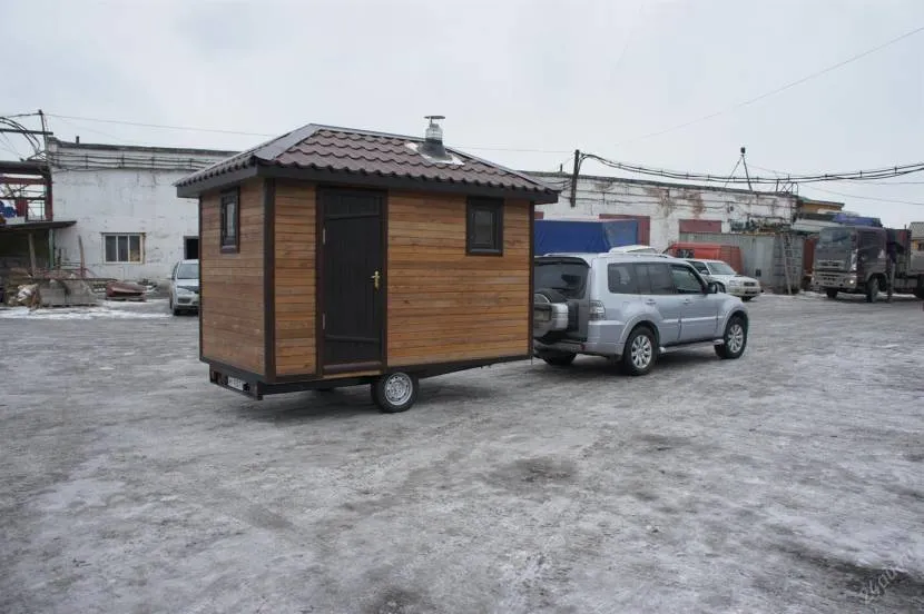 Баня а-ля прицепы должны иметь массу, которая бы не превышала вес тягача, т. е. легкового автомобиля. Дополнительные опоры должны исключать раскачивание прицепа в процессе эксплуатации. Внутреннее пространство разделено на парилку и предбанник. Из-за ограниченности пространства в такой бане нет баков для воды.