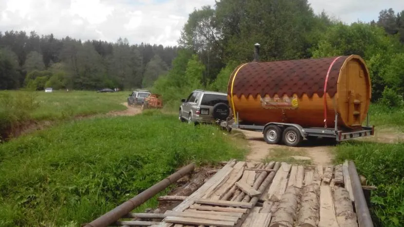 Прицеп рама с выполненной платформой, например, используемый для перевозки лодки, можно использовать в случае перевозки по необходимости мобильной бочки. Баня бочка на прицепе закрепляется к готовой платформе с помощью специальных креплений перед транспортировкой.