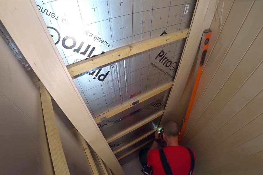 Стены, потолок обшивают липовой вагонкой. Обязательно оставьте зазор по 5 см снизу от пола и у потолка. Полы устилают под наклоном в сторону слива. Затем монтируют плинтуса из липы или лиственницы.