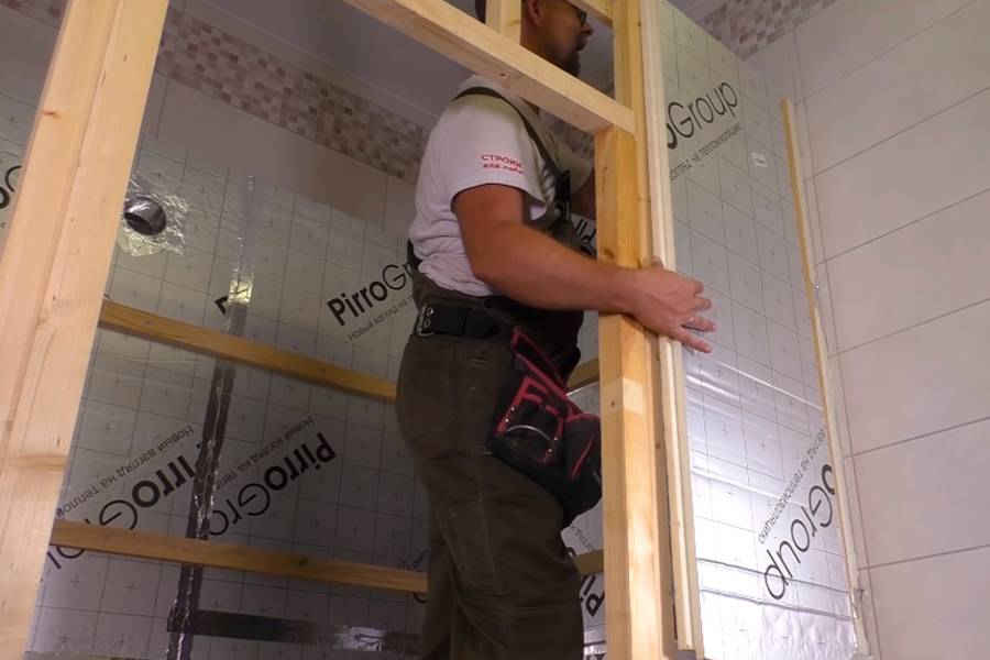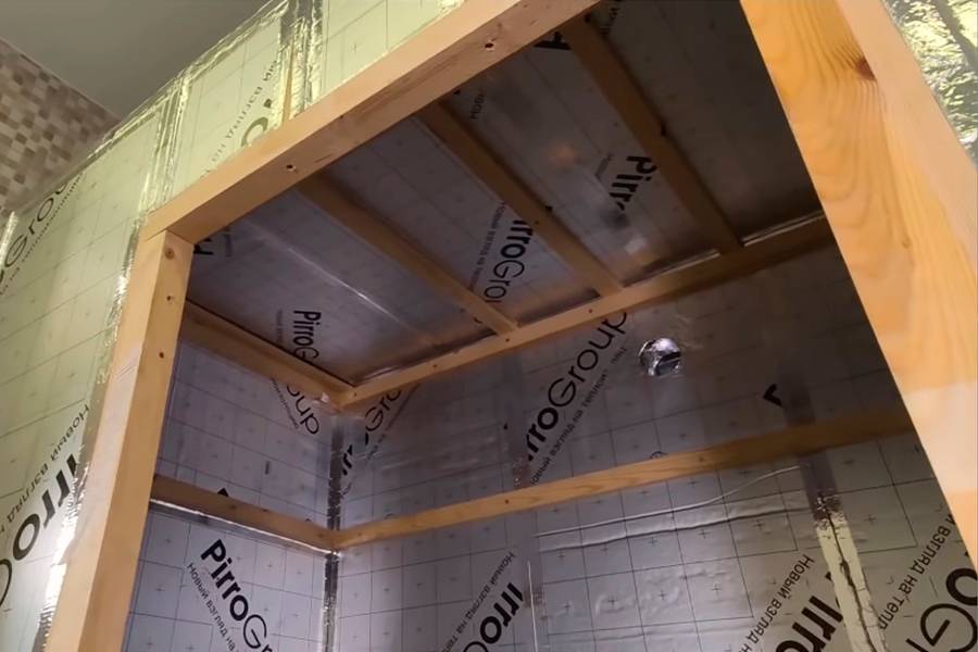 Самодельная сауна в квартире выполняется из деревянного каркаса. В месте установки стены помещения обшивают минеральной ватой, делают облицовку брусом. Стены собирают на готовом каркасе из вагонки или распила кедра, пихты, ели. Толщина не менее 12 мм. Сосну, осину и липу не используют из-за сильной смолистости. Перестенки, потолок и пол также проходят теплоизоляцией.