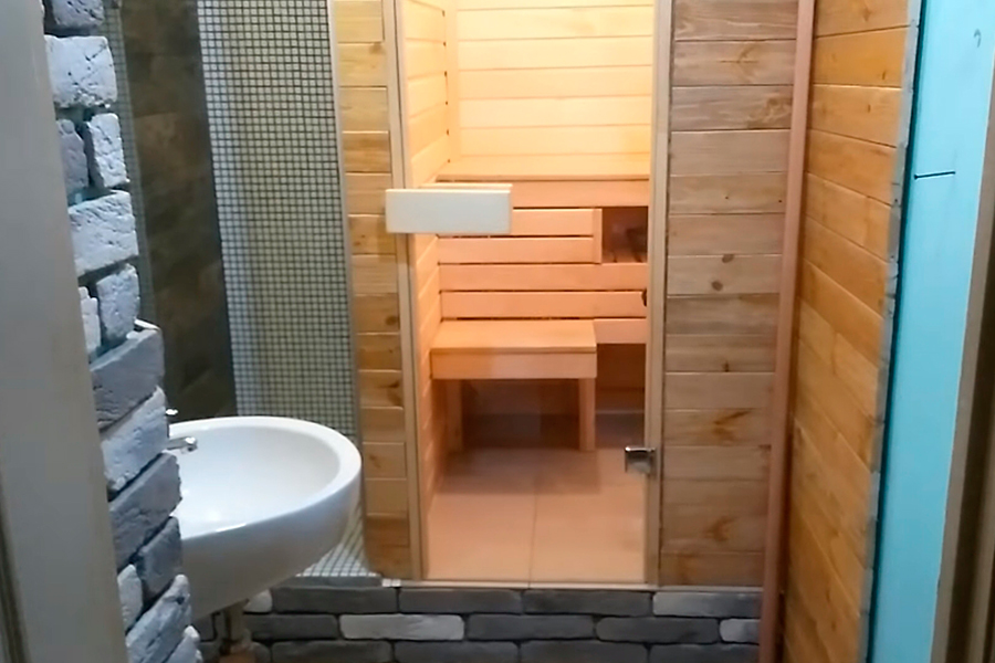 Снаружи сауну в ванной можно даже облицевать кафелем или пластиковыми панелями, обшить гиспокартоном или иным декоративным материалом.