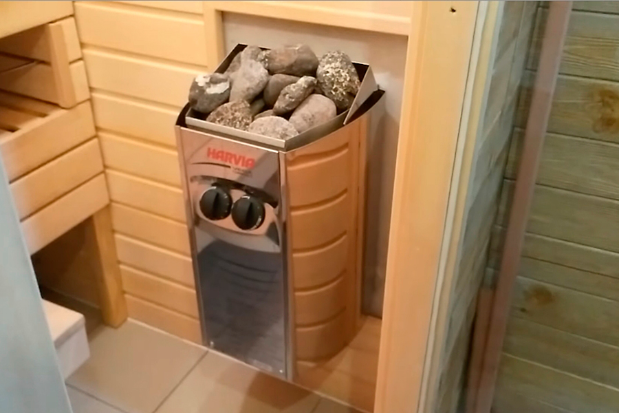 Печь подбирают инфракрасную либо электрическую каменку из расчета мощности 1 кВт на 1 кв.м пространства. Также понадобится термостат. Печь ставят на стене или на полу строго возле двери.