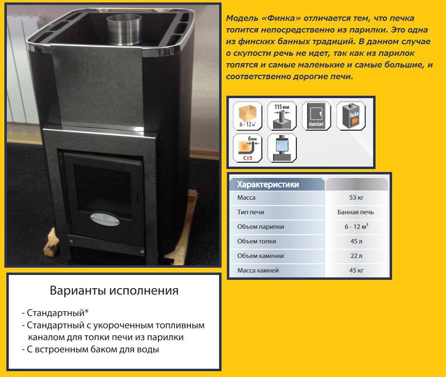 Финка. Еще одна печь без выносной топки. Имеется возможность регулировать температуру парилки с помощью выдвижного зольного ящика — он увеличивает поступление воздуха и позволяет мягко снизить избыточный нагрев;