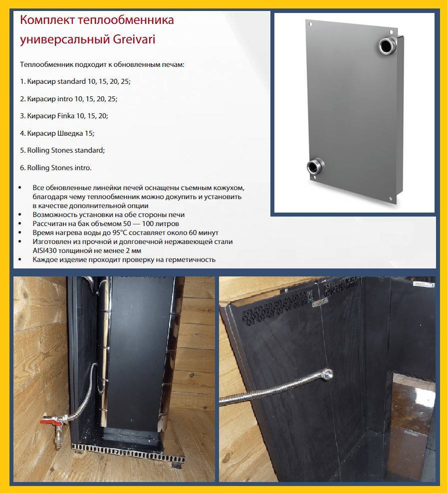 Каждую из описанных моделей для бани можно при желании укомплектовать теплообменником, который будет монтироваться в левую или правую стенку корпуса. Этот элемент необходим для нагрева воды в резервуаре, если тот находится на большом расстоянии от отопительного прибора. Все теплообменники выполнены из миллиметровой «нержавейки» (AISI 430), имеют объем 3 л и оснащены парой патрубков диаметром ¾ дюйма.