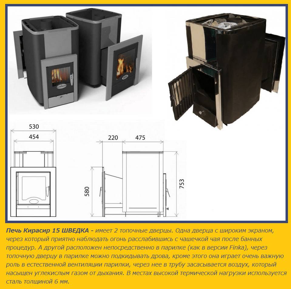 Шведка. Стандартная конструкция, без выносной топки. Топить ее можно только из парилки. Обладает возможностью обеспечить усиленную вентиляцию в парилке с помощью шиберной заслонки;
