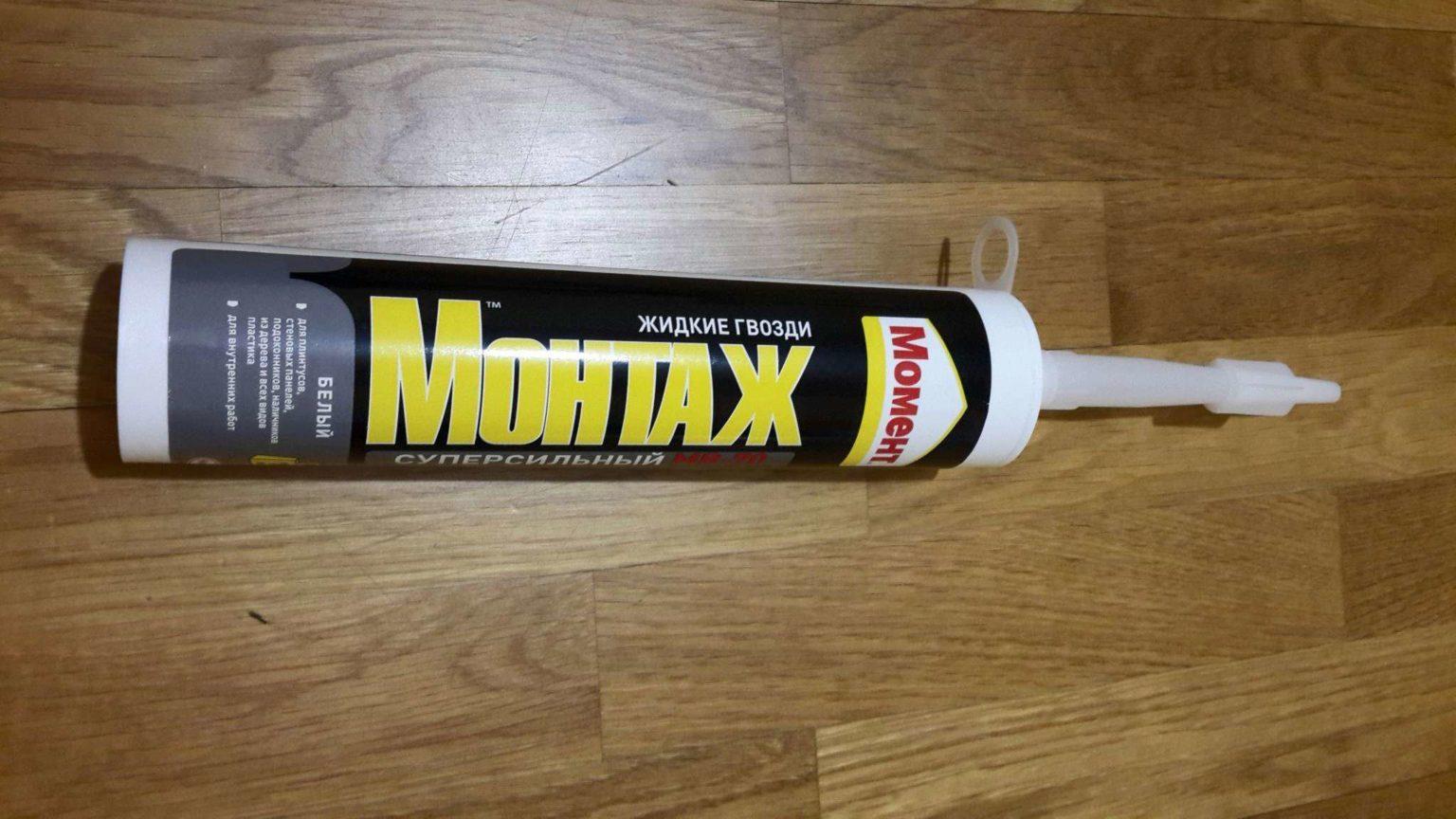- Жидкие гвозди. Этот вид клея часто используют профессионалы. Жидкие гвозди густые, поэтому на неровных участках их кладут толстым слоем. Для плитки выбирают клей белого цвета, без растворителей, особенно при работе с тонким материалом. Также его применяют для оформления швов. Наиболее известные марки «Момент монтаж» и «Tytan». Для нанесения понадобится строительный шприц.