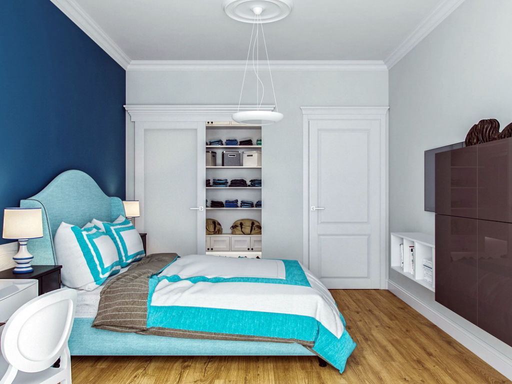 Морская гамма оттенков выигрышно сочетается с современной мебелью и модерновой отделкой интерьера. Стену, где располагается спальное место, можно подчеркнуть узорчатыми обоями, а остальную часть комнаты сделать со светло бирюзовыми стенами.