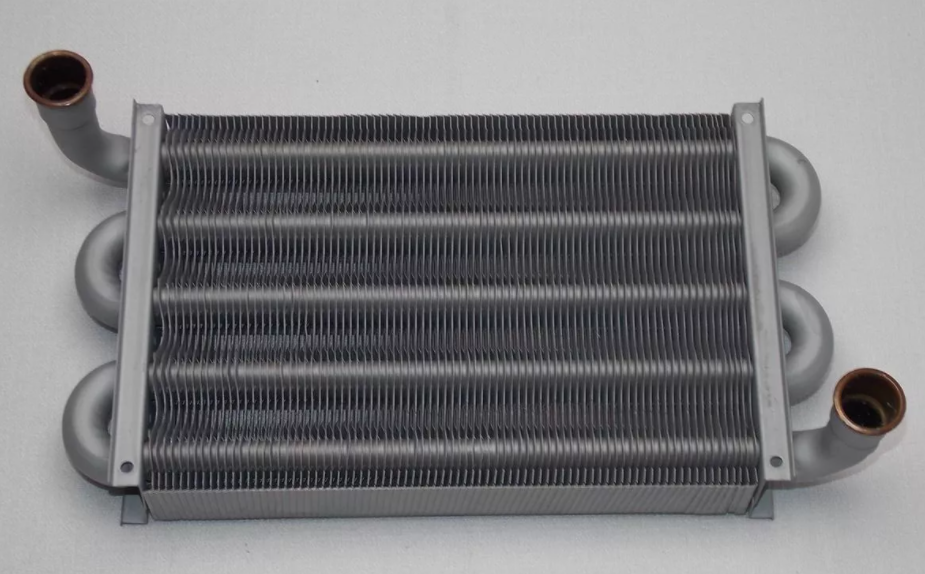 Теплообменник — это емкость, где тепловая энергия, выделяемая при сгорании газа в газовой горелке, передается тепловому носителю. Конфигурация теплового обменника может быть разной и зависит от того, как устроен газовый котел. По способу передачи тепловой энергии от источника тепла жидкому теплоносителю их делят на теплообменники первичного и вторичного (сдвоенного) типа, а также битермические.