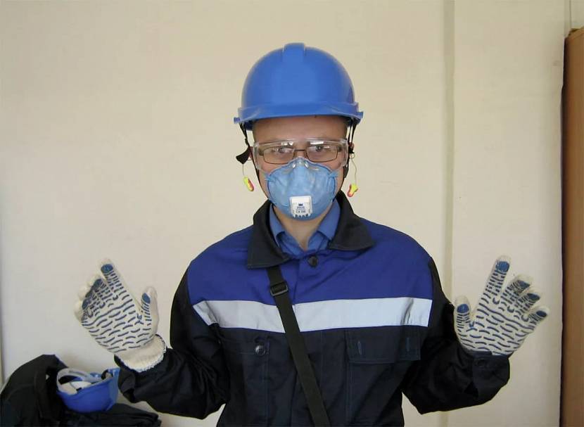 Так, работу с битумной мастикой необходимо вести в плотной одежде, специально выпускаемой для строителей. Чтобы избежать повреждения глазных яблок от твёрдых частиц и едких испарений, используются специальные очки. Если работа ведётся с горячей мастикой, необходимо использовать респиратор.