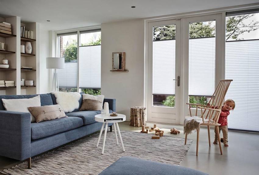 - Жалюзи-плиссе – материал шторы сложен в виде гармошки. Регулировка осуществляется особыми шнурами и лентами, на концах которых есть специальные фиксаторы.