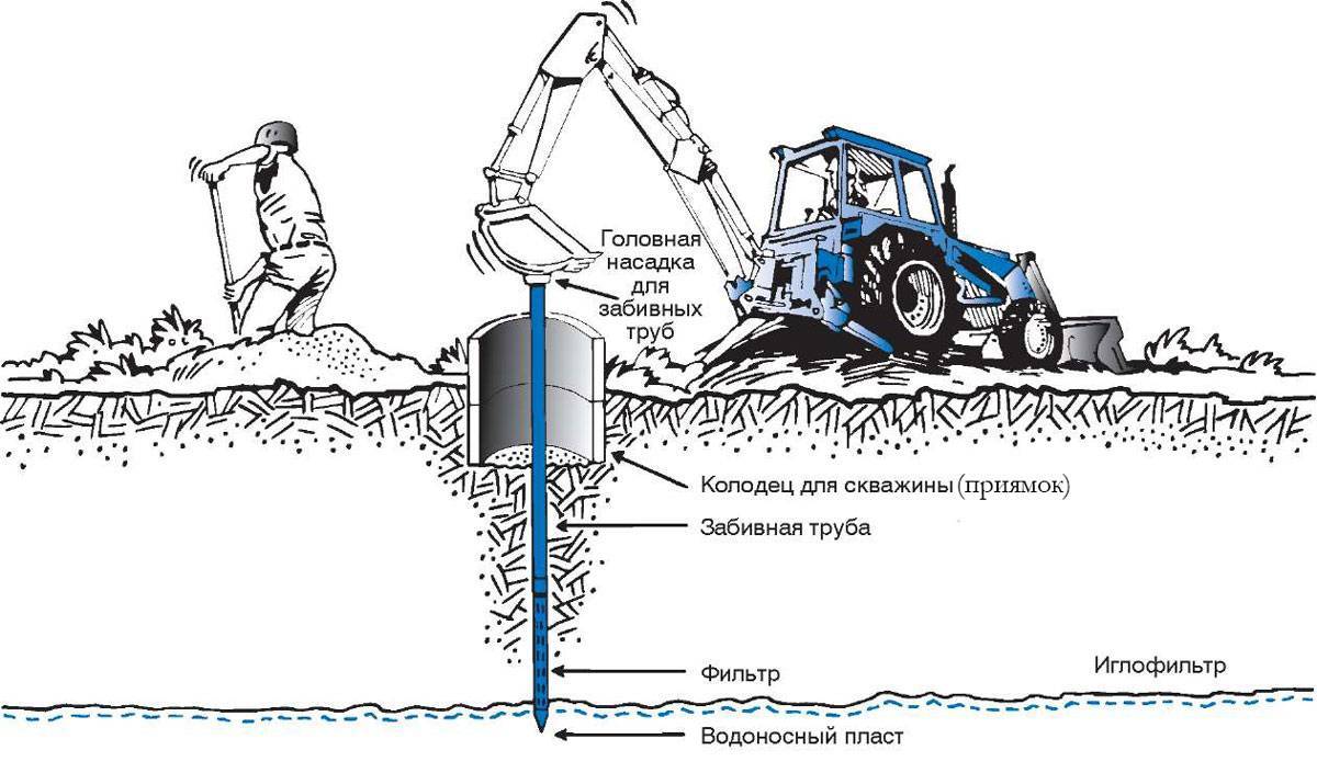 В центр приямка устанавливают бурильное оборудование. Процесс бурения осуществляют разными способами, выбор которого зависит от типа почвы и глубины залегания вод, но всегда состоит из трех этапов: