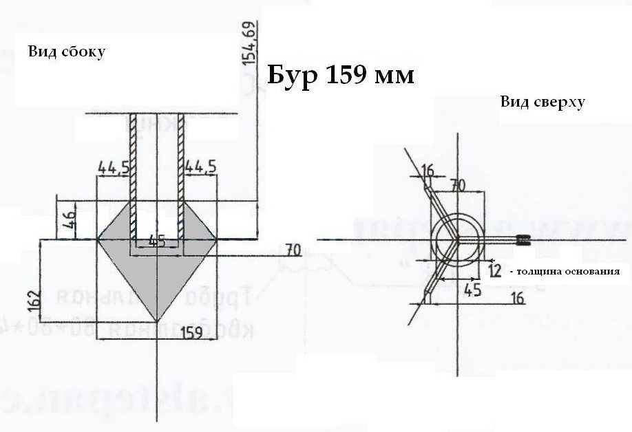 Простой форты бур можно сделать самостоятельно — их варят из обычной стали (чертеж на фото ниже). Если брать высоколегированную сталь, ее сложно приварить к штангам. Для сложных и каменистых грунтов лучше купить бур в специализированной кампании — они имеют сложную форму, есть много разных видов.
