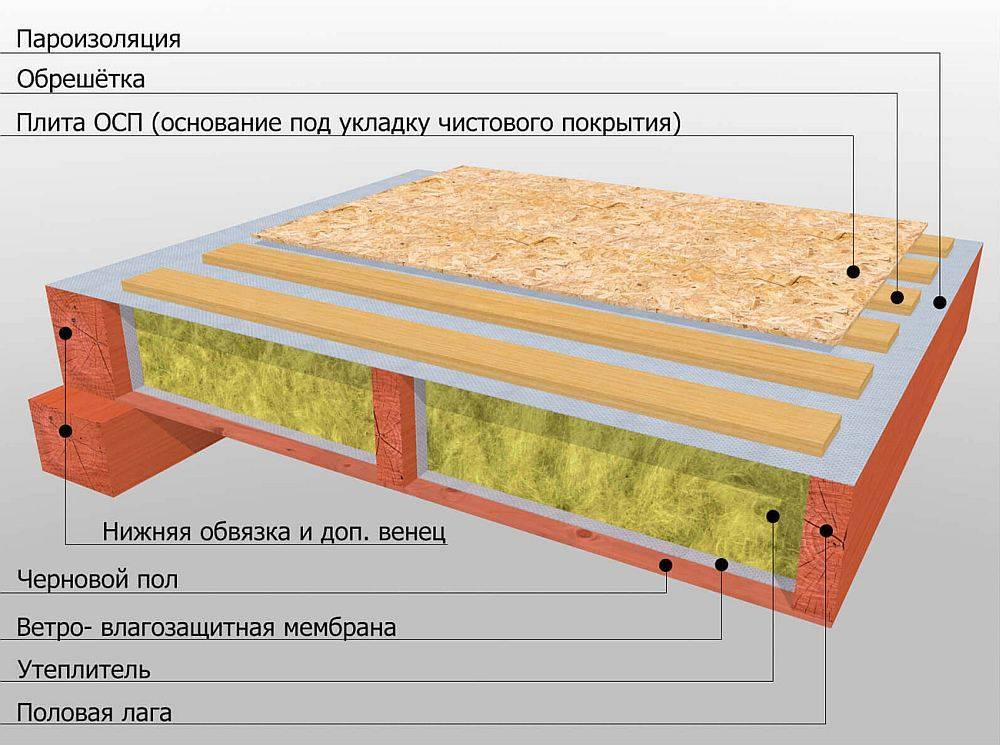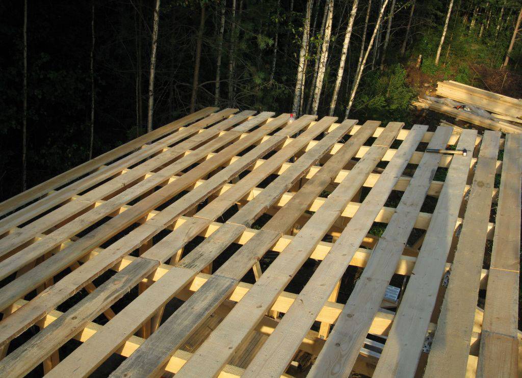 Для лаг нужен брус 50х100 мм, монтируют его ребром вниз, на 3 продольных балки венца, вставляя в прорезы размером 30 мм в нижней обвязке. Шаг берется 60 см.
