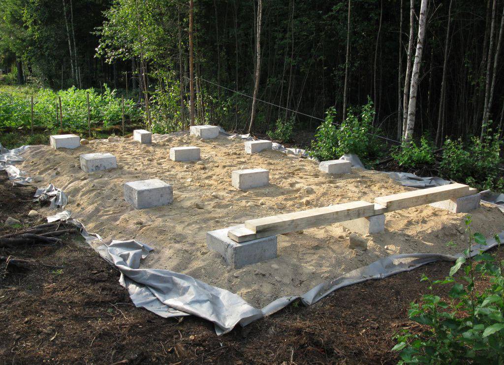 Далее устанавливаем фундамент. Для этого понадобятся бетонные блоки или кирпичные опоры до 200 мм.