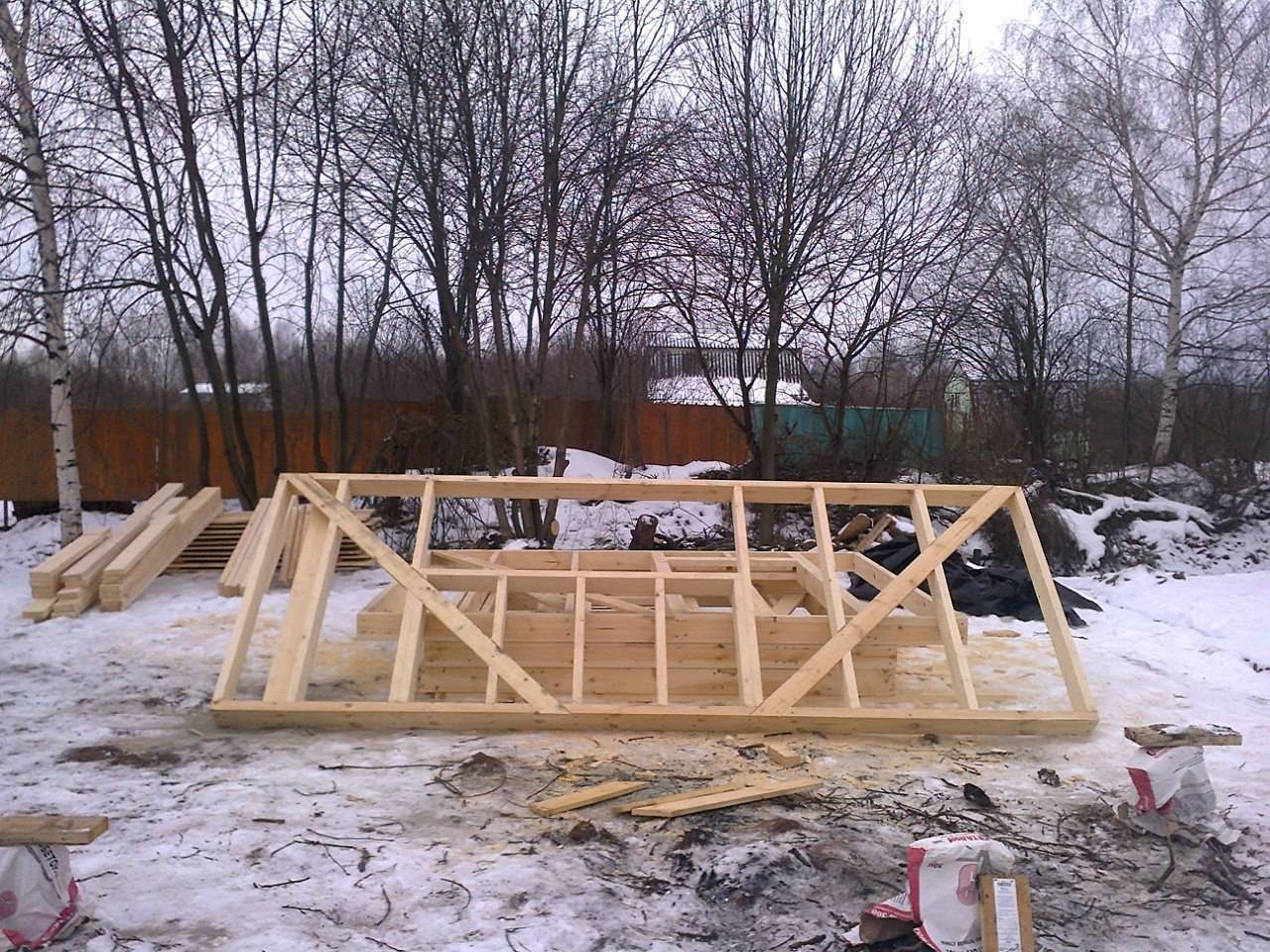 С боковых сторон к ним прибивают бруски, куда укладывают доски чернового пола и теплоизоляцию с гидробарьером.