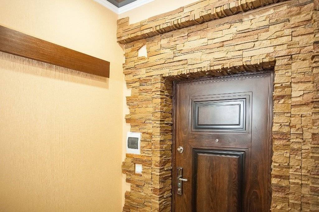 Оформление поддельным камнем, реализуемым в виде тонкого плиточного либо гибкого материала, смотрится оригинально, весьма роскошно. Такое изделие придает дополнительный объем, вес, что следует учитывать при монтаже. Наклеивание производится на все полотно, отдельные его части, углы откосов. Для этого приобретается специальный клей. Полностью оформленная псевдокамнем дверь смотрится так, как будто выполнена из него целиком.