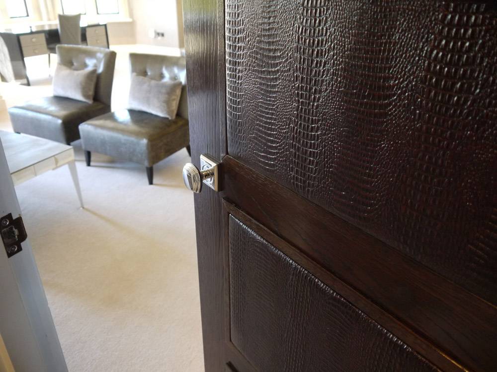 Натуральной кожей обивают двери в дорогих, роскошных интерьерах. Оформление смотрится красиво долгие годы, имеет уникальную фактуру.