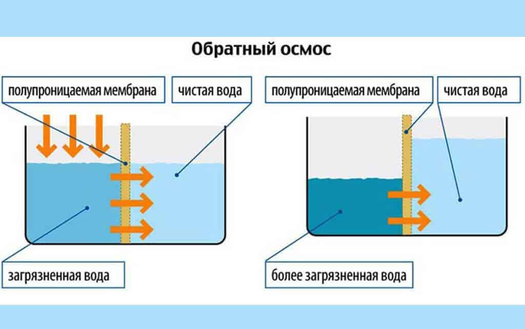 Особенность работы таких систем заключается в том, что мембрана, расположенная в основе, по принципу обратного осмоса пропускает частицы воды и кислорода, но задерживает различные примеси.
