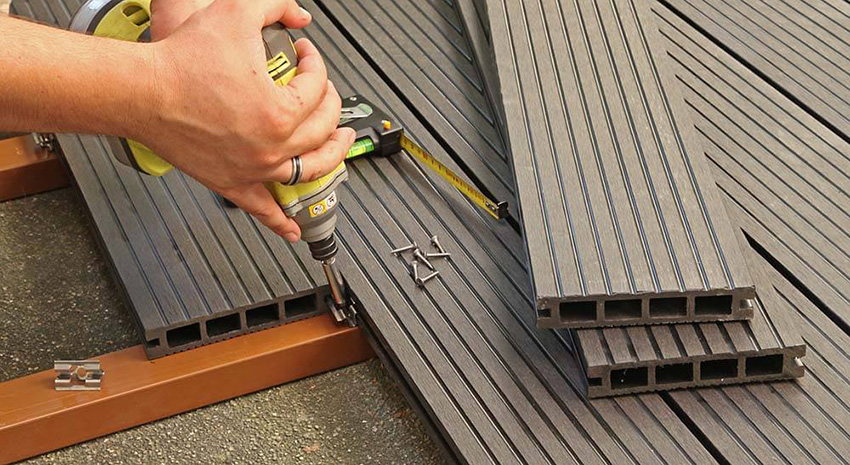 - Для монтажа террасной ДПК доски понадобиться такие материалы: отвертка или шуруповерт с набором бит, линейка или рулетка с карандашом, ручная пила или лобзик, прорезиненная киянка.