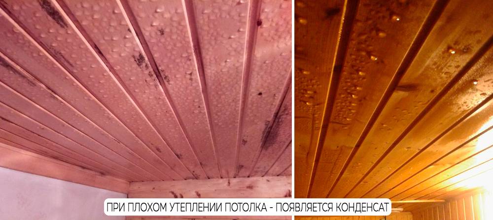 Как правило, потолок в бане подшивается досками. Если он холоднее остальных поверхностей или предметов, на всей поверхности начнется активное оседание конденсата. Находиться в таком помещении неприятно — влага капает сверху и делает процесс мытья менее комфортным.