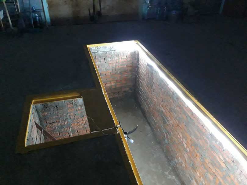 После застывания пола можно приступать к устройству стен смотровой ямы. Многие автовладельцы решают выполнять их в полкирпича. До уровня локтя можно пользоваться круговым методом укладки. Когда кладка стен смотровой ямы достигнет уровня 1,2 м, следует выполнить нишу для различных инструментов. Ее высота равняется 3 рядам кирпичей. Сверху углубления укладывается обработанная доска.