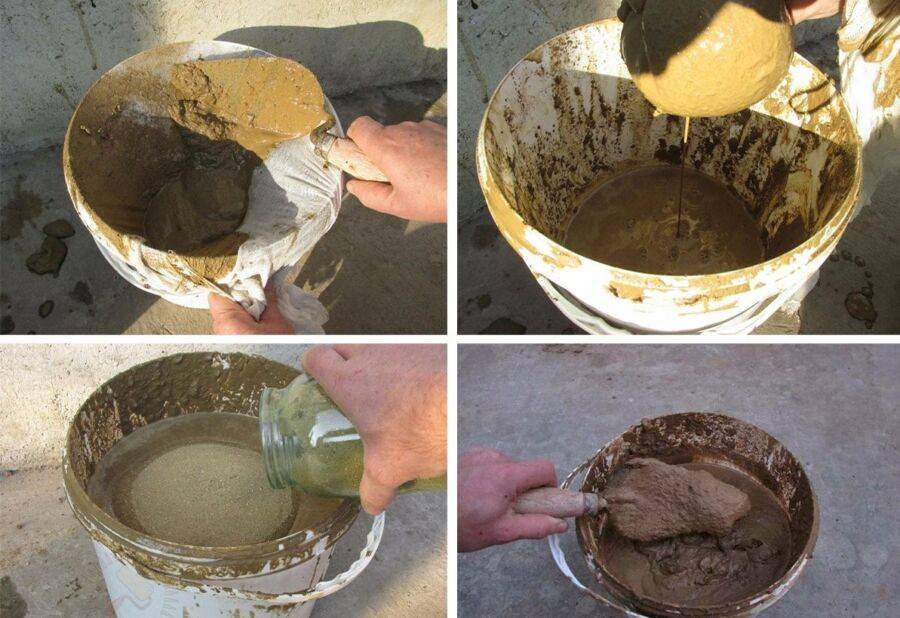 - Подготовки раствора из шамотной термоустойчивой глины, речного песка и обычной воды в пропорции 2:1:1, в который затем необходимо будет еще добавить сухой строительный клей в небольшом количестве (для наилучшей сцепки раствора с заделываемой поверхностью).