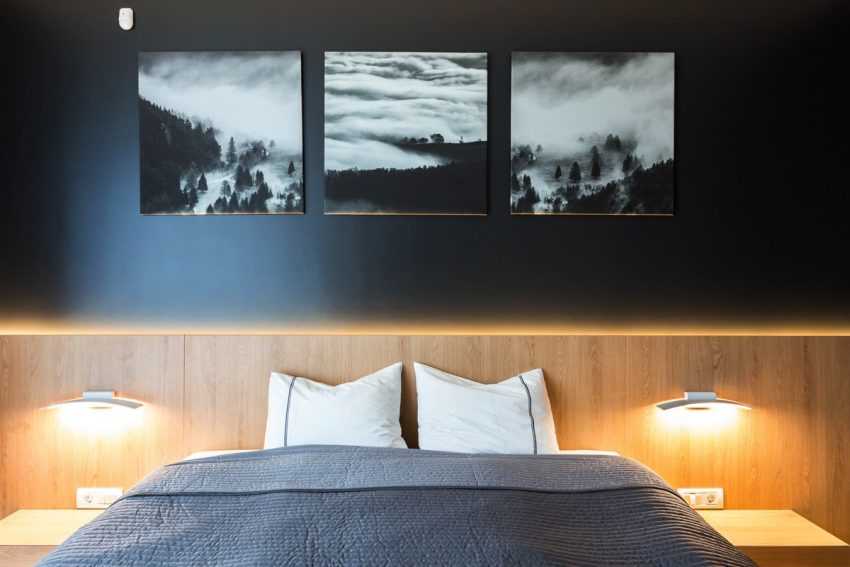 Одним из плюсов черного в спальне считается максимальная темнота, не дающая яркому солнцу или уличному освещению проникнуть сквозь шторы.