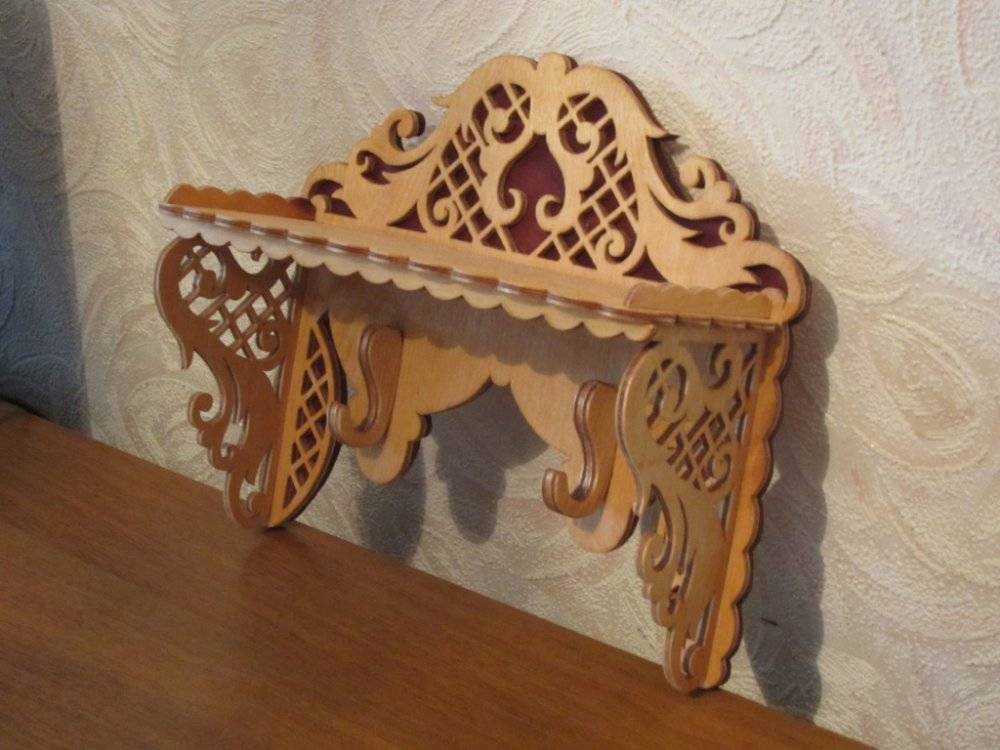 Достигнув желаемого результата, переходят к сборке деталей поделки, подготовленных чудо лобзиком. Интересный чертеж для выпиливания и фото полочки представлены ниже:
