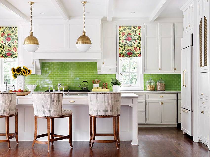 В таком варианте оформление должно быть примерно следующим: стены зеленоватые, гарнитур и мебель белые, можно с салатовыми вкраплениями. Фартук следует выбирать двухцветный, бело-салатовый, например, плитку в виде шахматной доски. Это отличный выбор!
