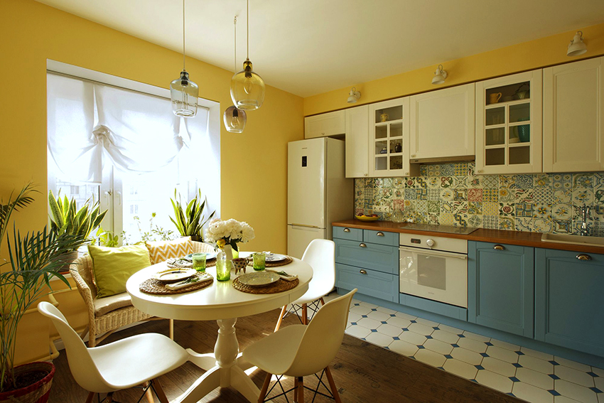 Чаще всего в интерьере светлых кухонь встречается сочетание таких цветов, как белый, бежевый и желтый. Преимуществом такого варианта считается то, что данная комбинация подойдет для оформления любого стиля. Другим популярным решением является комбинирование в интерьере кухни голубого, желтого и лавандового цветов, которые в большей степени подойдут для создания легкой и воздушной кухни в стиле прованс.